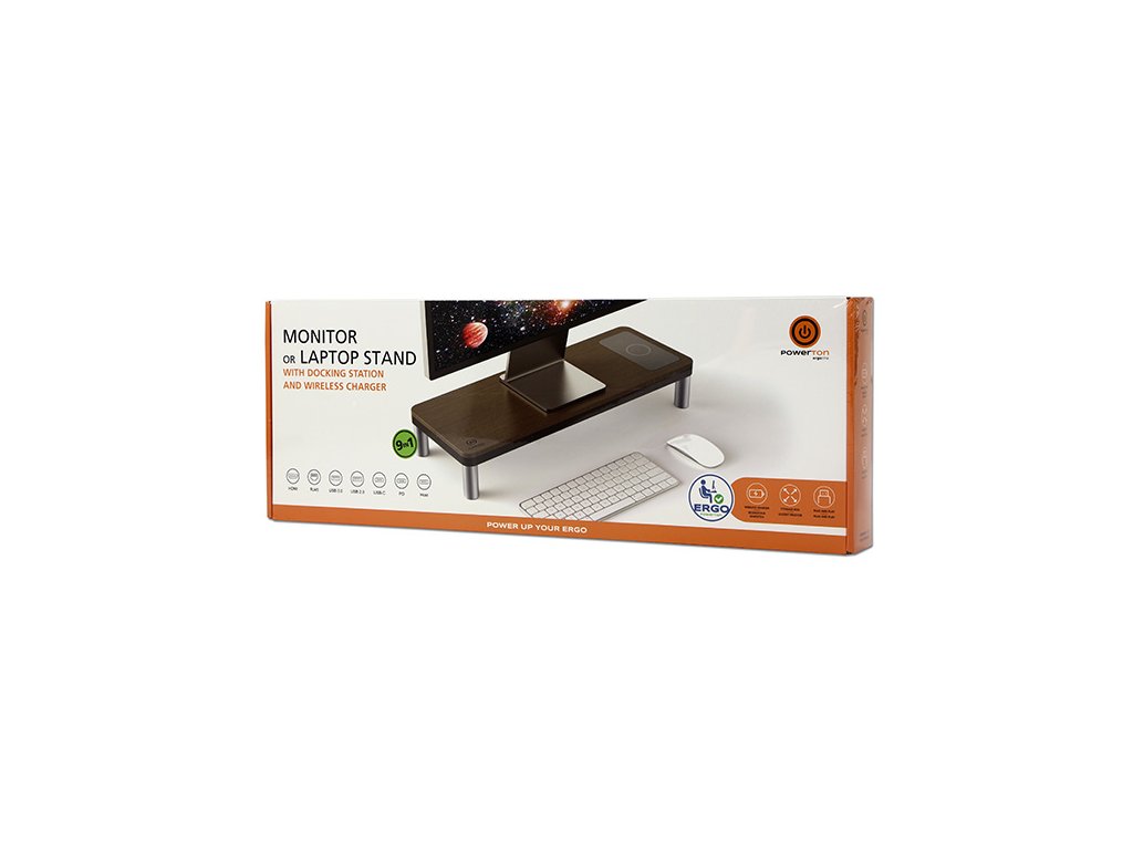 Powerton ERGO DOKY Podstavec pod monitor s dokovací stanicí a bezdrátovou nabíj, šedý + tmavý dřevodekor
