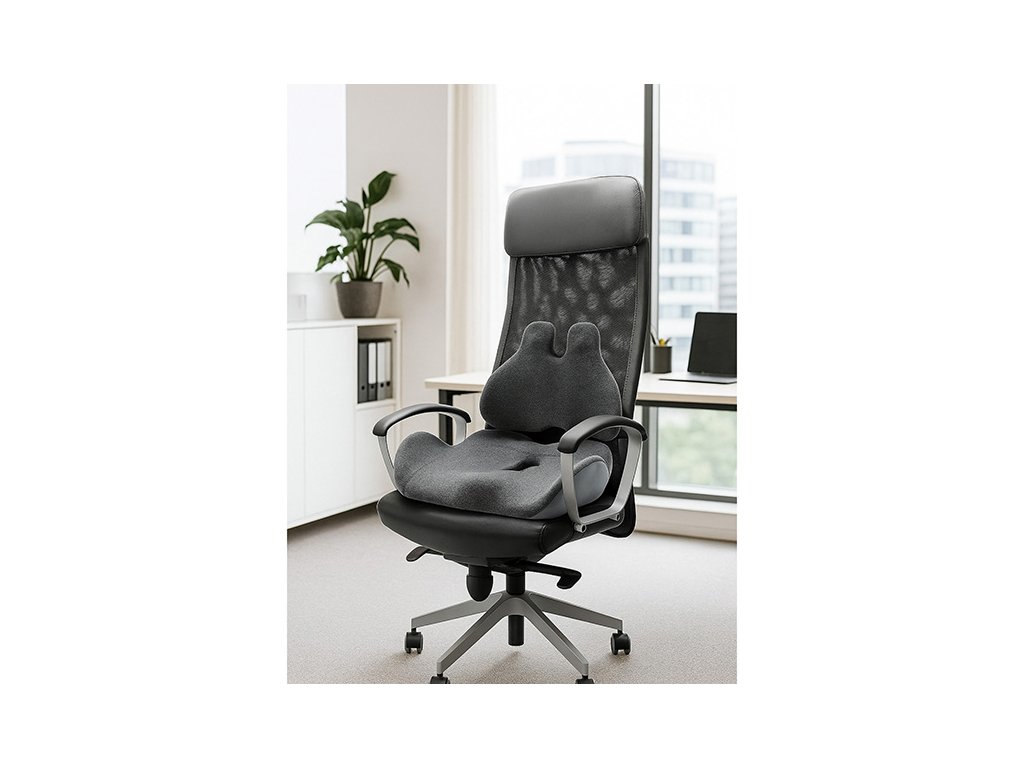 Chraňte svá záda a pracujte efektivněji s naší sadou ergonomických polštářů. Bederní opěrka a podsedák vám poskytnou optimální podporu páteře a uleví od bolestí zad, které mohou vzniknout dlouhým sezením. Oba polštáře jsou vyrobeny z vysoce kvalitní paměťové pěny, která se přizpůsobí tvaru vašeho těla a zajistí maximální pohodlí. Elegantní barevné sladění dodá vašemu pracovnímu prostoru šmrnc a vytvoří příjemné prostředí pro dlouhé hodiny práce.