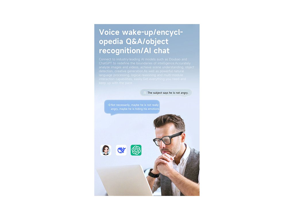 Díky vestavěné umělé inteligenci se z brýlí stává váš osobní asistent. Dokážou rozpoznávat objekty kolem vás, automaticky vytvářet zápisy z porad a pomohou vám i při studiu či práci. Nechybí simultánní překlad a vícejazyčný překlad v reálném čase, takže se bez problémů dorozumíte kdekoliv na světě. Chytré funkce pracují okamžitě a nenápadně – stačí jen mít brýle na sobě.